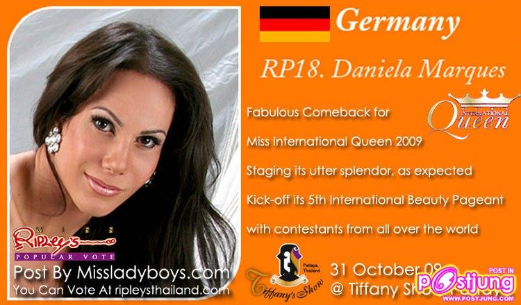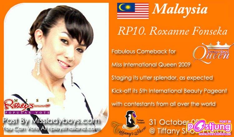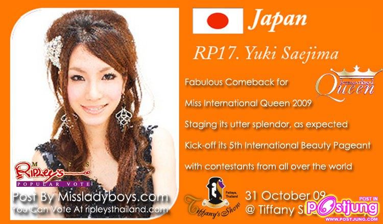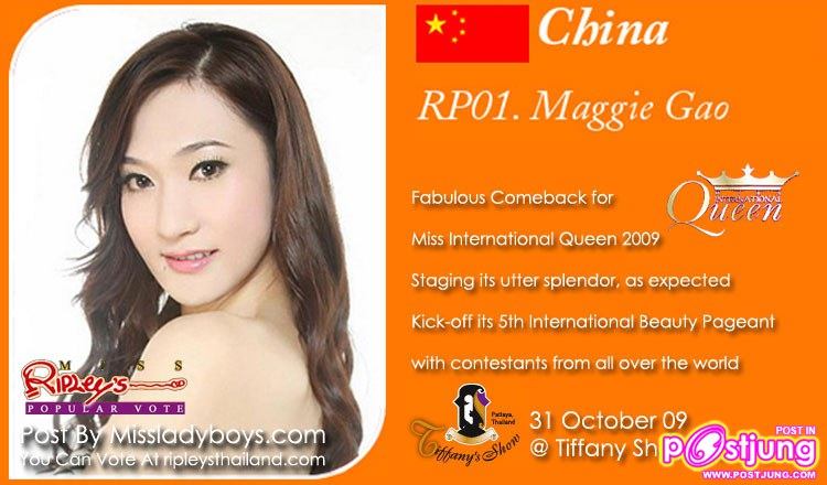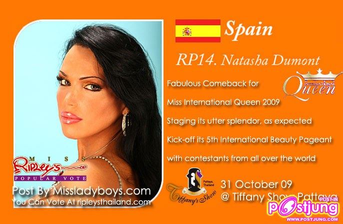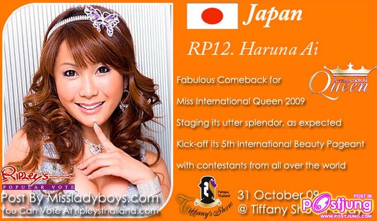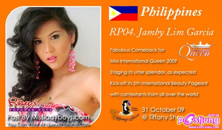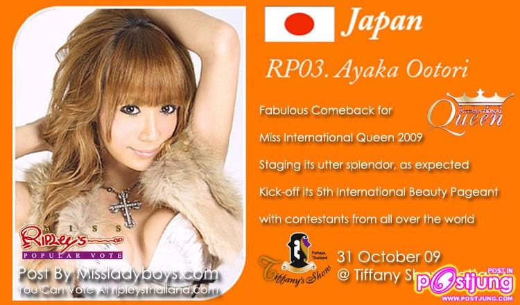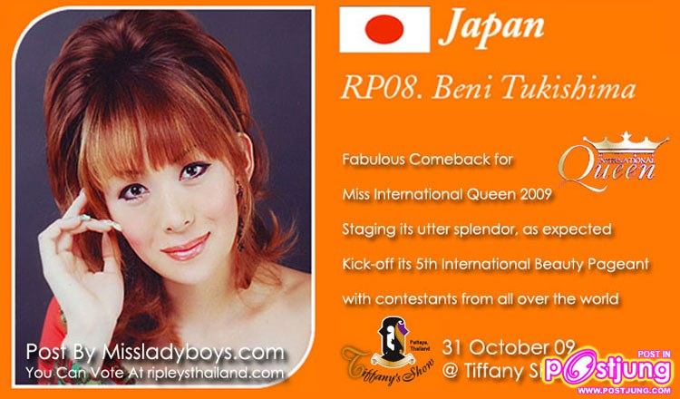 โพสท์โดยมาดูโฉมหน้าผู้เข้าประกวด miss International Queen 2009 ในปีนี้กัน เพื่อนๆช่วยดีด้วยนะคะว่า ประเทศไหนสวย แต่ยังไงก็อย่าลืมช่วยเชียร์ 2 สาวจากไทยด้วยนะคะ คือ น้องโหน่ง กับน้องแจ๊ส