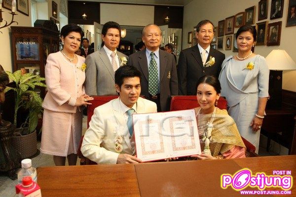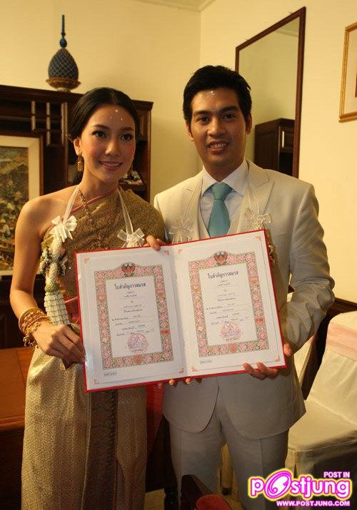 หลังหลั่งน้ำสังข์เสร็จ "นุ่น-ต๊อด" ได้จดทะเบียนสมรสในเวลา 09.30 น. โดยมีนายทะเบียนจากสำนักงานเขตบางรัก ร่วมเป็นสักขีพยาน ต่อด้วยพิธีสงฆ์ถือว่าเป็นอันจบพิธีหมั้นหมายของคู่รักคนดัง จากนั้น "นุ่น-ต๊อด" ได้แถลงข่าวเปิดใจกับสื่อมวลชนที่ห้องเจ้าพระยา รร.แมนดาริน โอเรียนเต็ล โดยทั้งคู่เผยว่ารู้สึกตื่นเต้น และเป็นครั้งแรกที่ต่างคนต่างเขิน ฝ่ายชายได้ทำเซอร์ไพร์สมอบของขวัญให้คู่หมั้นสาว รวมใส่ไปในสินสอดด้วย ส่วนแหวนเพชรที่สวมให้ "นุ่น" นั้น เป็นของขวัญที่ได้มาจากแม่ ด้านนางเอกสาวได้ตกลงปลงใจใช้คำนำหน้าว่า "นาง" และเปลี่ยนนามสกุลเป็น "ภิรมย์ภักดี" แพลนฮันนีมูนอีก 3-4 เดือนจะไปเที่ยวอเมริกา และยังไม่รีบปั๊มทายาทแต่อย่างใด